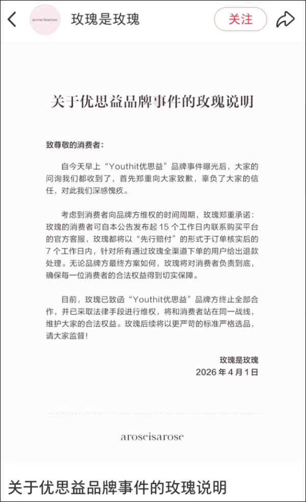 章小蕙官方品牌“玫瑰是玫瑰”4月1日晚些时候发声明道歉,并承诺,消费者可自本公告发布起15个工作日内联系购买平台的官方客服,品牌都将以“先行赔付”的形式于订单核实后的7个工作日内,针对所有通过玫瑰全渠道下单的用户给出退款处理。